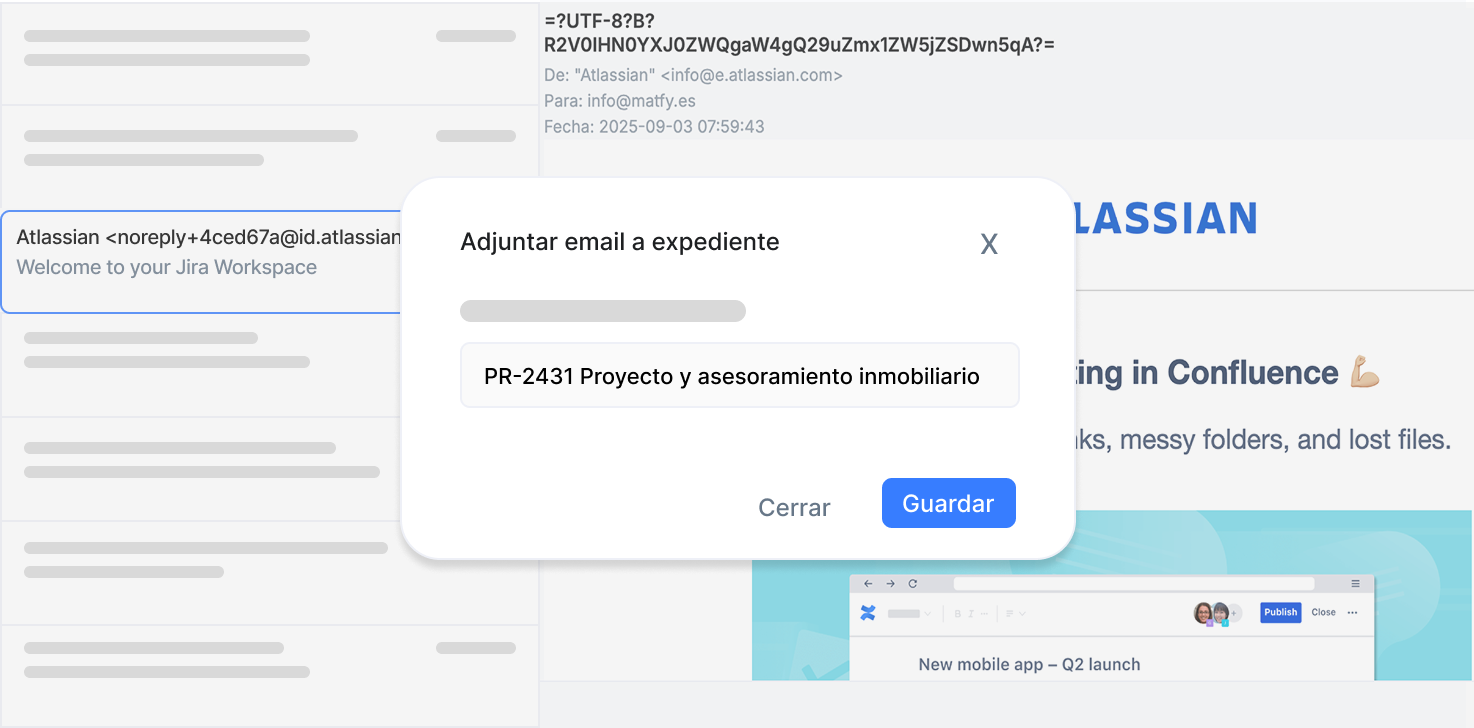 Cada archivo o documento enviado por correo se almacena automáticamente en el expediente correspondiente. Busca, descarga o comparte adjuntos fácilmente, manteniendo la información segura y organizada.